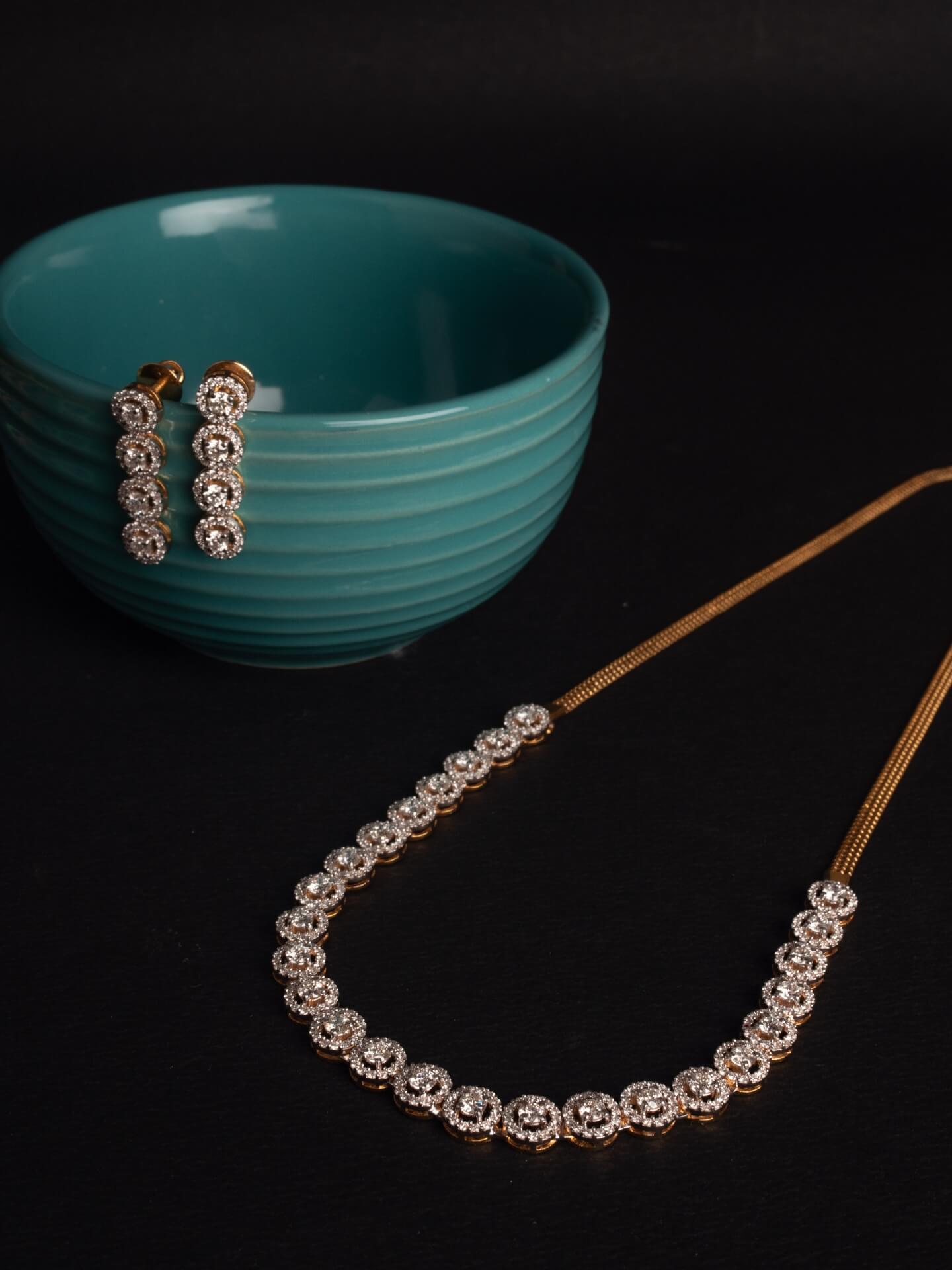 Jewellery as an idea and concept should be free from restrictions. The Halo Setting Pattern allows just that as it goes well with both Indian as well as Western wear. Pointer Diamonds surrounded by smalled Diamonds as an outer maximize the diamonds luster and brilliance. The earrings are done in a screw system and the necklace is fitted with adjustable loops to adjust as per attire. This piece has all the makings of a modern classic.