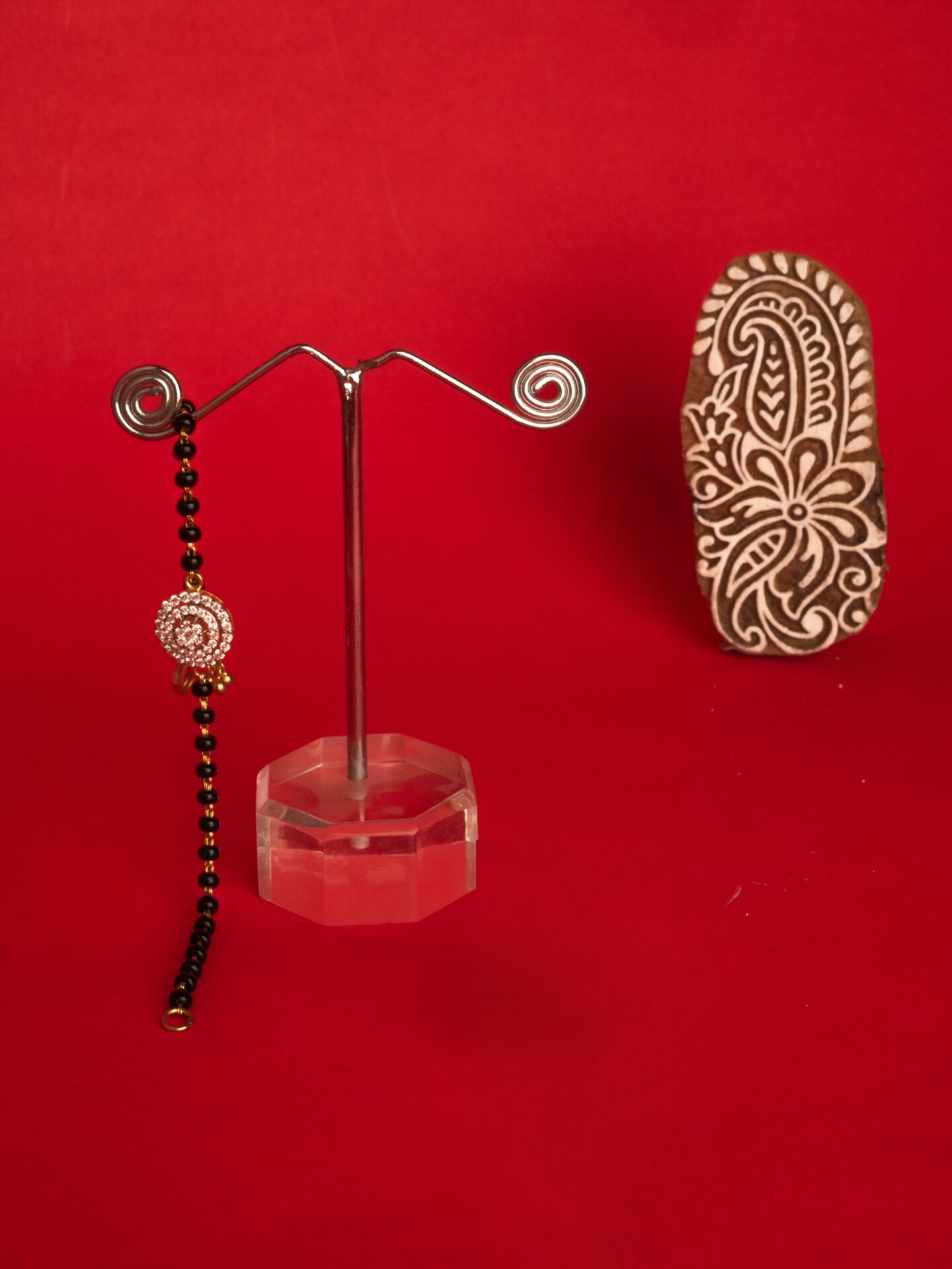 The beautiful thing about love is the many forms it can be expressed in. The Mangalsutra Bracelet is one of the newer forms. Gold Wires fixed between Black Glass Beads with a resplendent Halo Setting centrepiece is a complete look in itself. It is both comfortable and durable for daily wear. This is worn like a tennis bracelet and is compatible with both Indian and Western Wear.