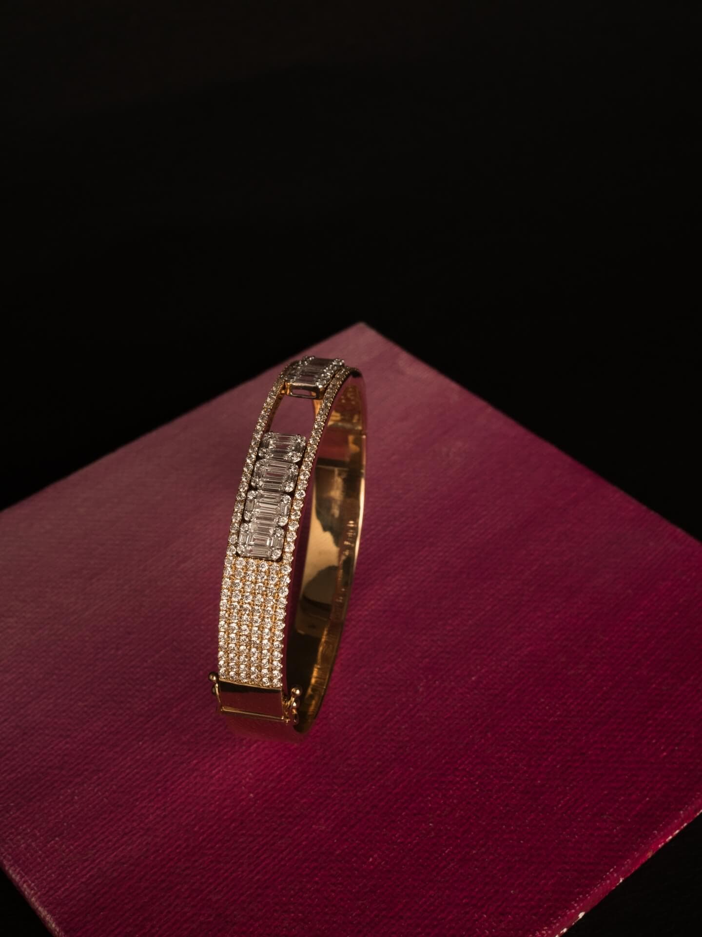 The Modern Chic look is a mix of subtlety and finer details. Jewellery can be interactive as well. The Emerald Cut Composite Diamonds are fitted into move around the bracelet. This is complement with small Round Brilliant Cut Diamonds studded in a Pave Setting. The design does not compromise on durability with with a twin lock and click system in place.