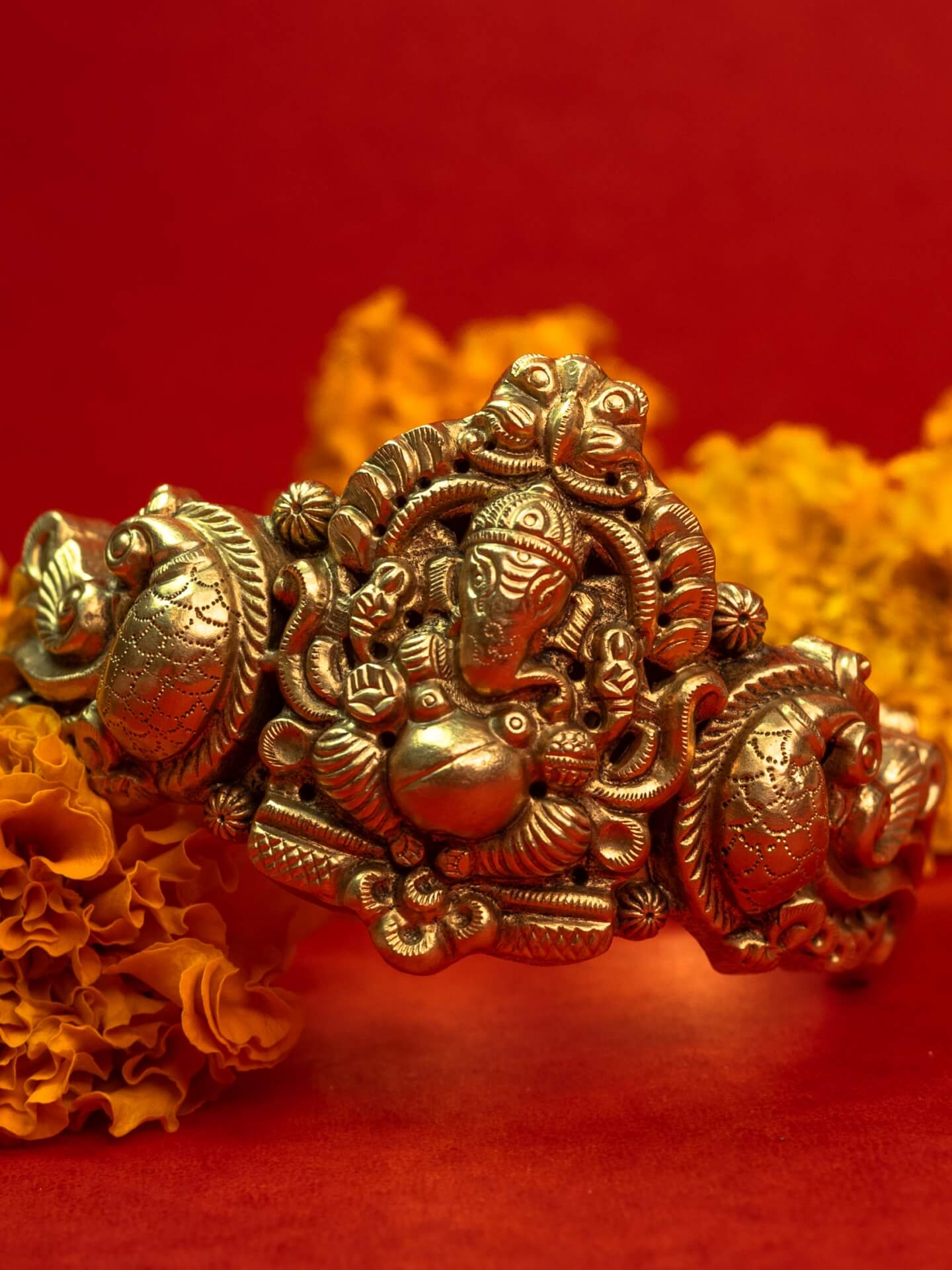 Temple Style Bracelet with multiple motifs and a Ganesha centerpiece. This piece uses a screw system for fastening and remains secure on the hand.