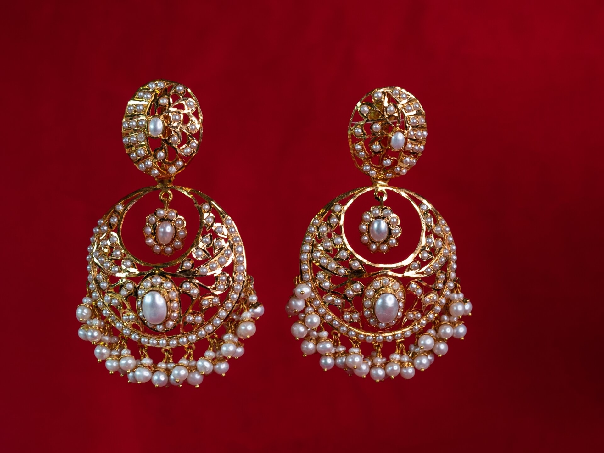 Pearls of variuos sizes come together to form this marvelous Chandbaali pair. Inspired by the Punjabi as well as Jaipur craftsmanship, this piece has been a head turner at our stores. Fastened with a screw system for added security. This can be paired with a necklace or even worn as is.