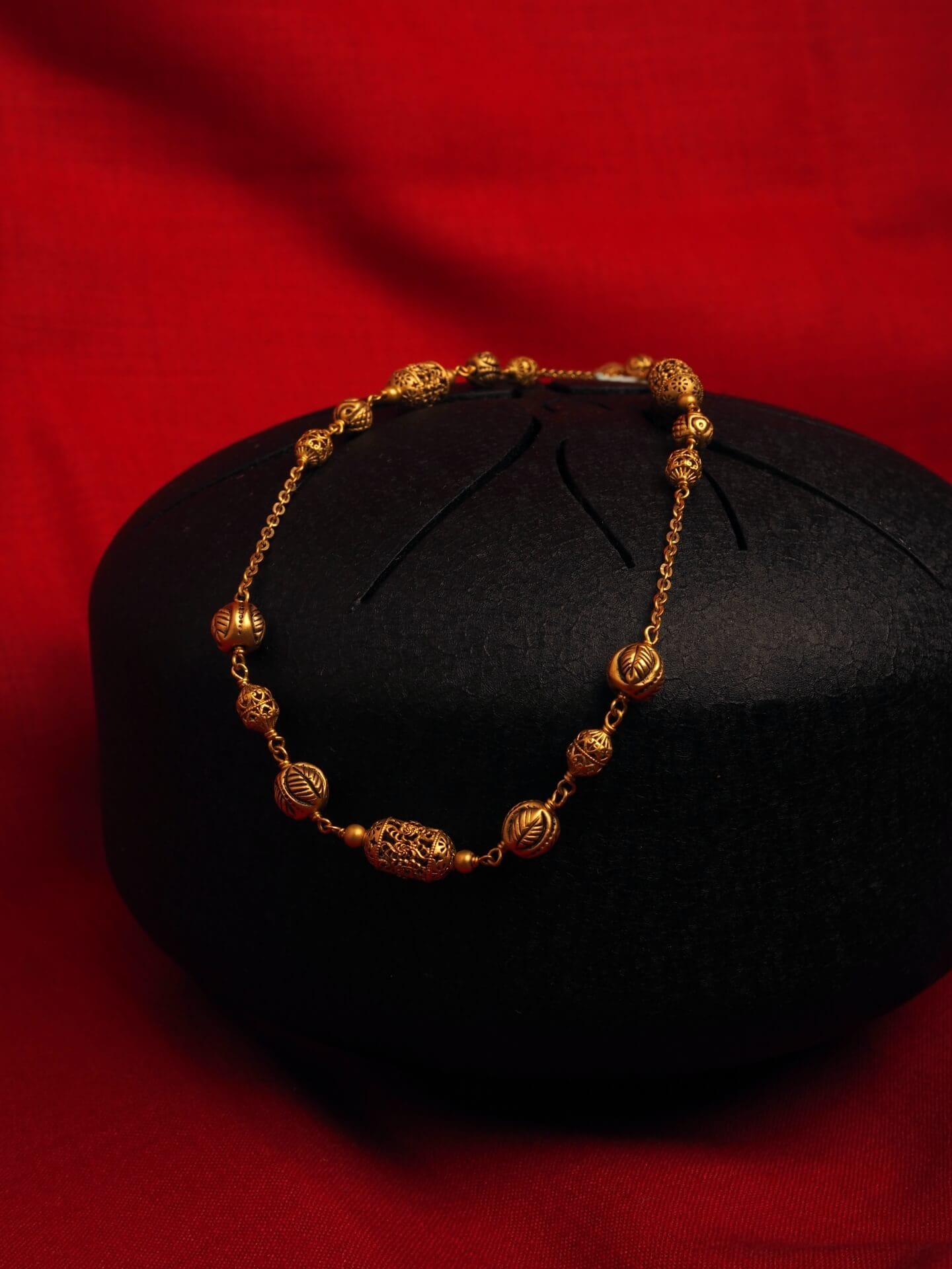 A thin chain good for functions and outings with temple style motifs. The gold has been dulled for maximum appeal.