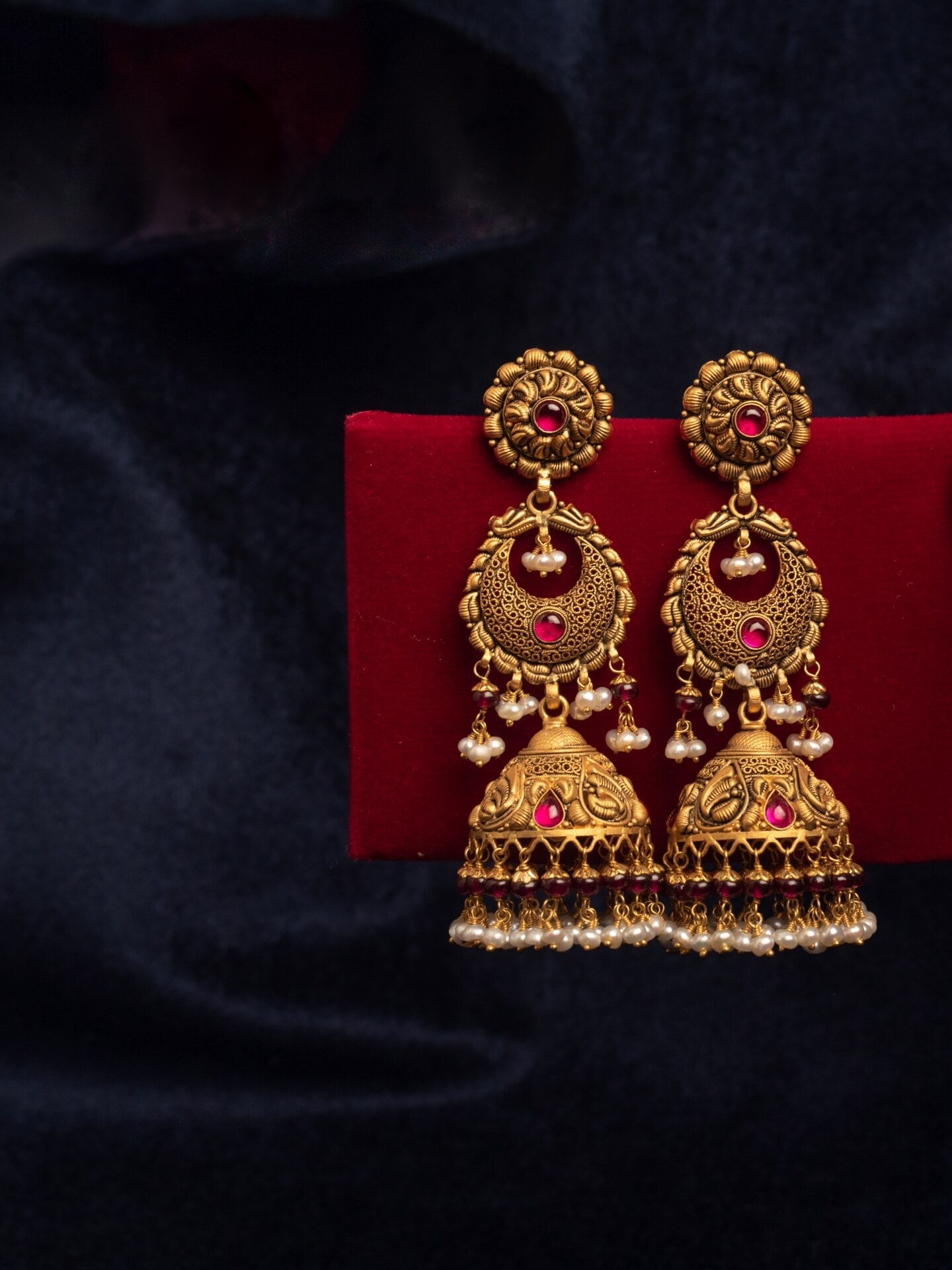 The combination of pearls and red stones with superior craftsmanship and detailed motifs blends into a beautiful pair of hanging earrings. Despite its appearance, the earrings are easy on the ears as they are lighter than they look but durable and secure at the same time.