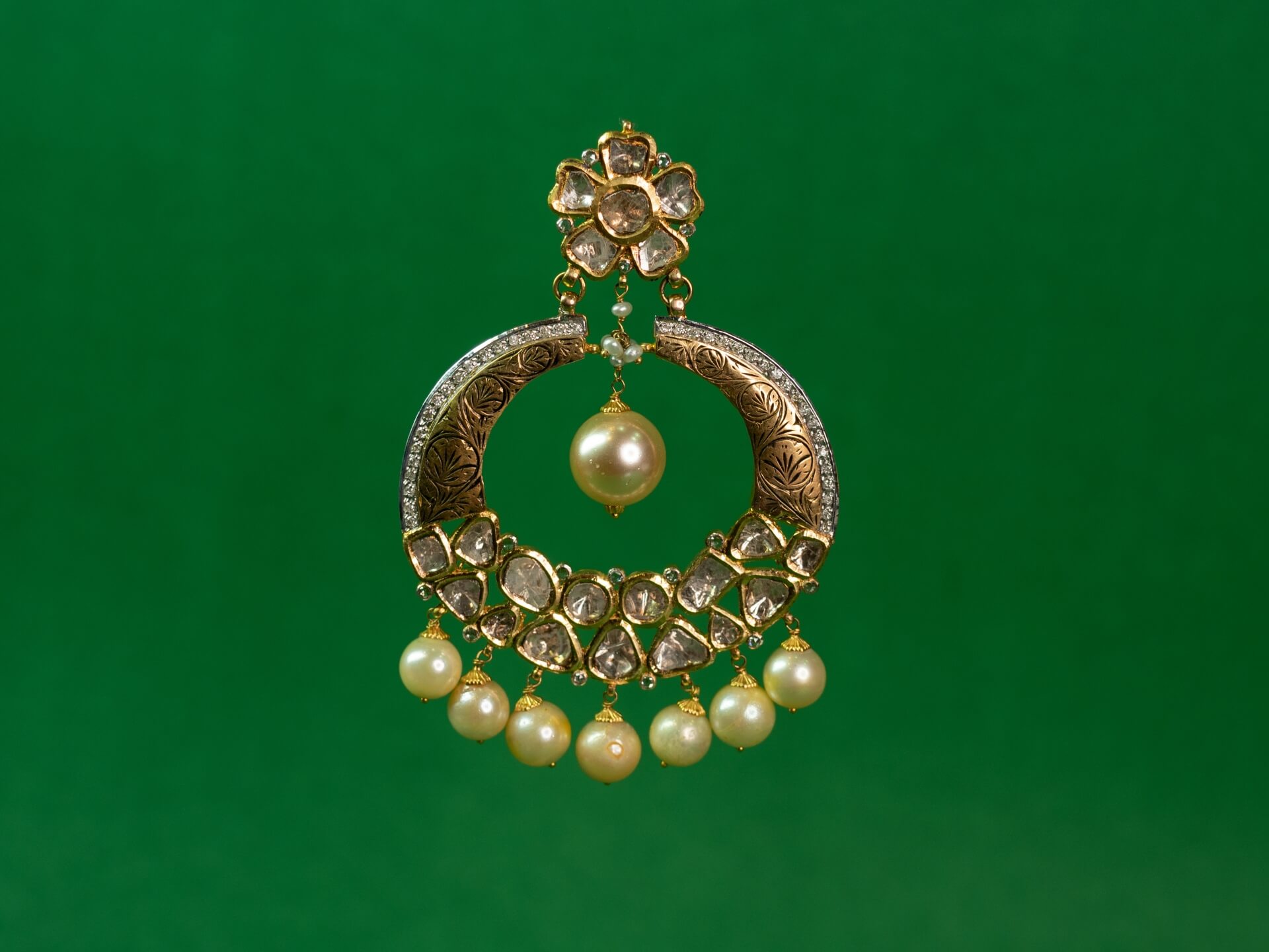 Polki Chandbali with Cut Diamonds and Pearl Drops
