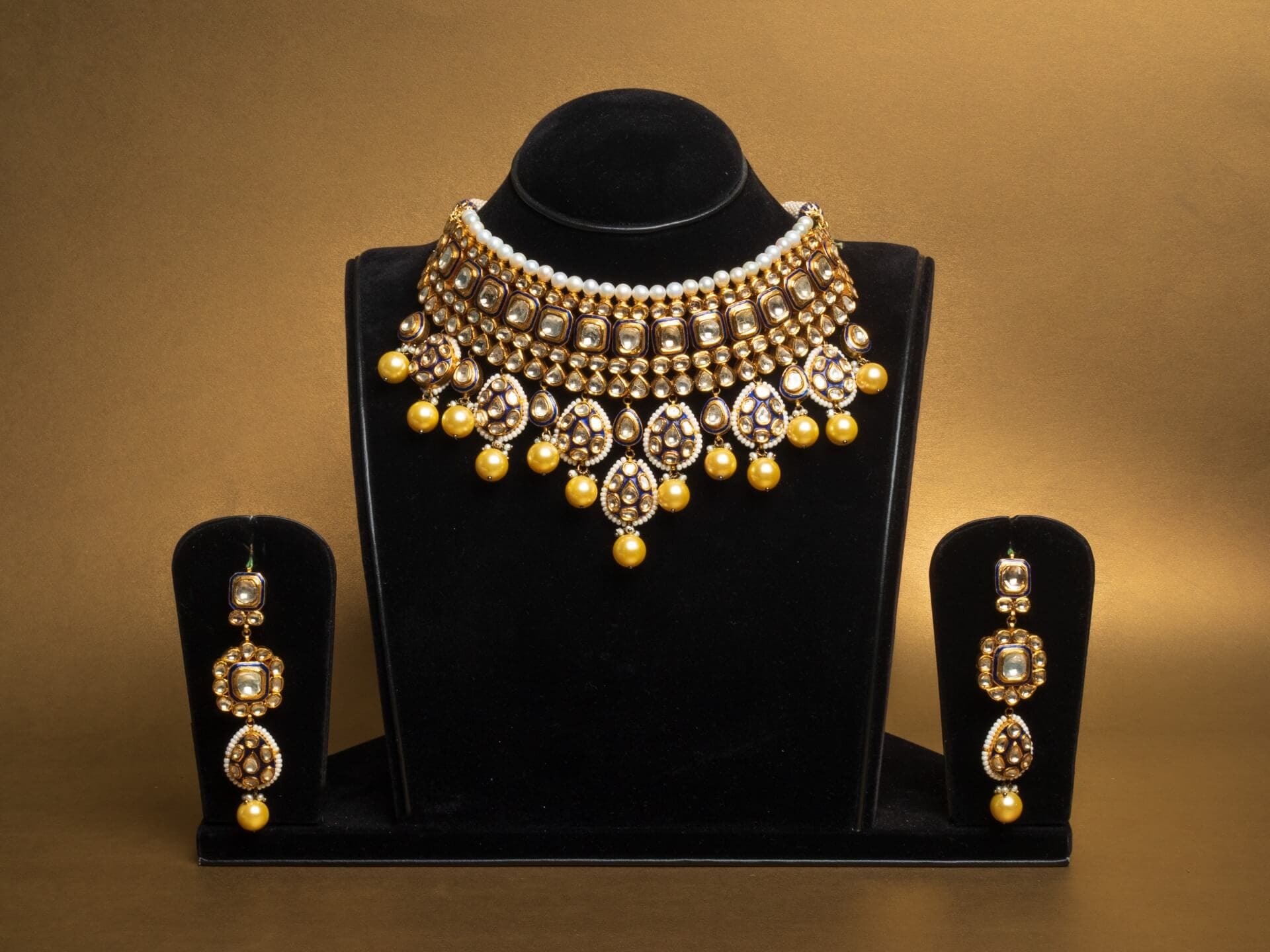 Royal Blue Enamel Work with a choker line and dull pearl drops condensed into one legacy piece. There is also a significant presence of small pearls to complete the look.